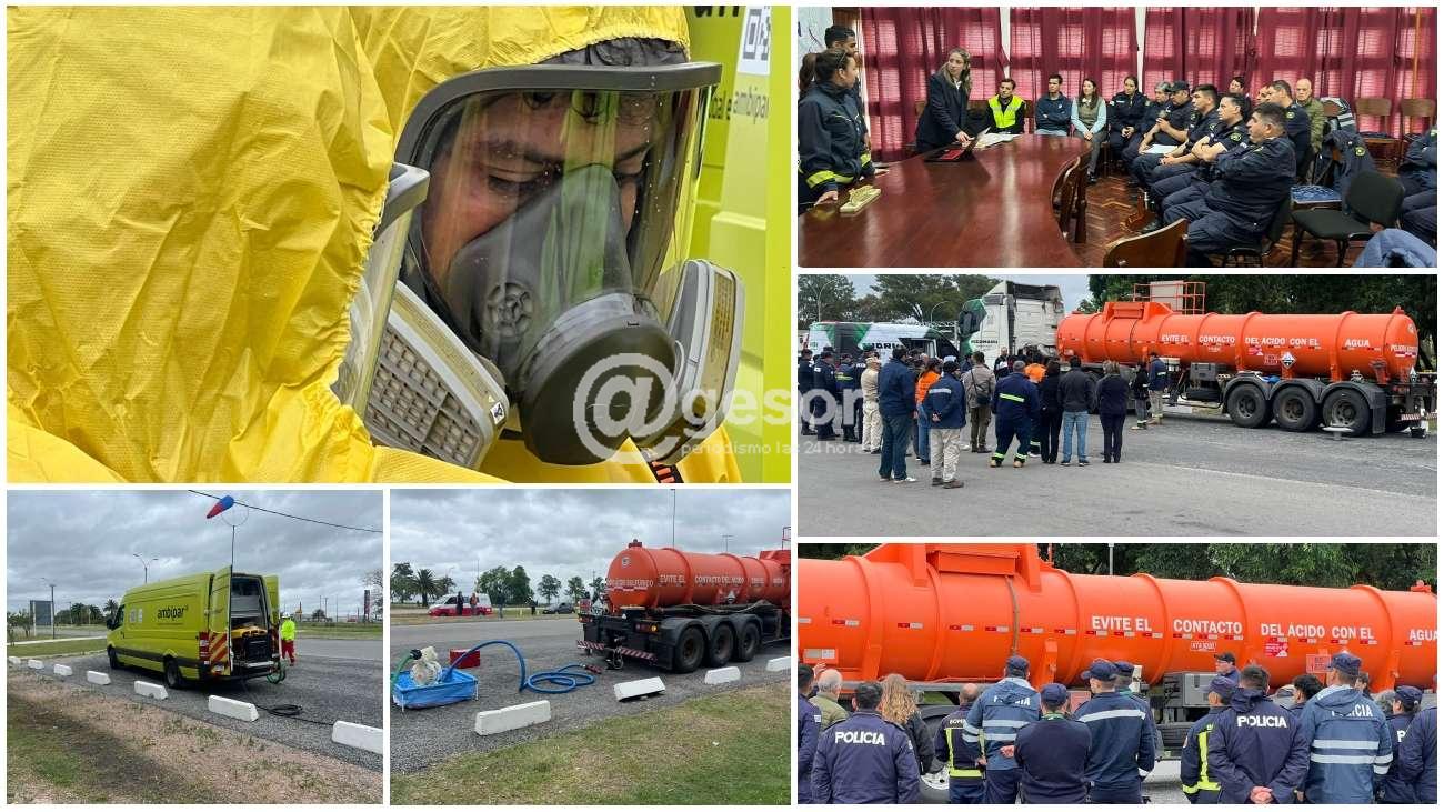 Durante la jornada se llevó a cabo un simulacro que incluyó una demostración práctica de trasvase seguro de sustancias líquidas, utilizando agua por razones de seguridad. La instancia permitió que Bomberos, Policía Nacional, Policía Caminera, personal de tránsito, funcionarios municipales y el equipo especializado HAZMAT exhibieran los procedimientos aplicables en caso de derrames o accidentes con materiales peligrosos.