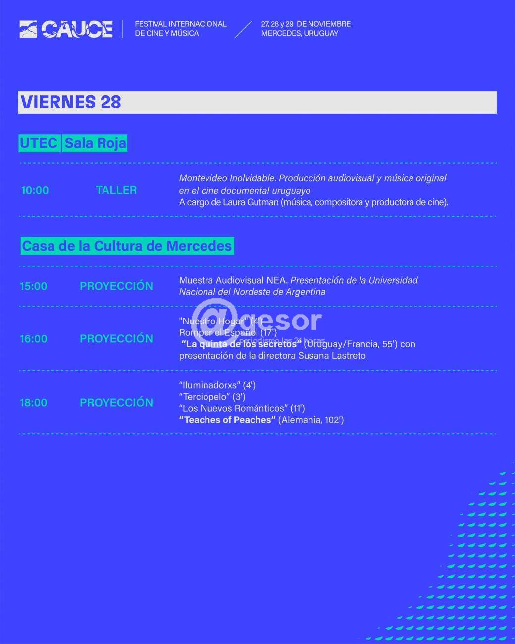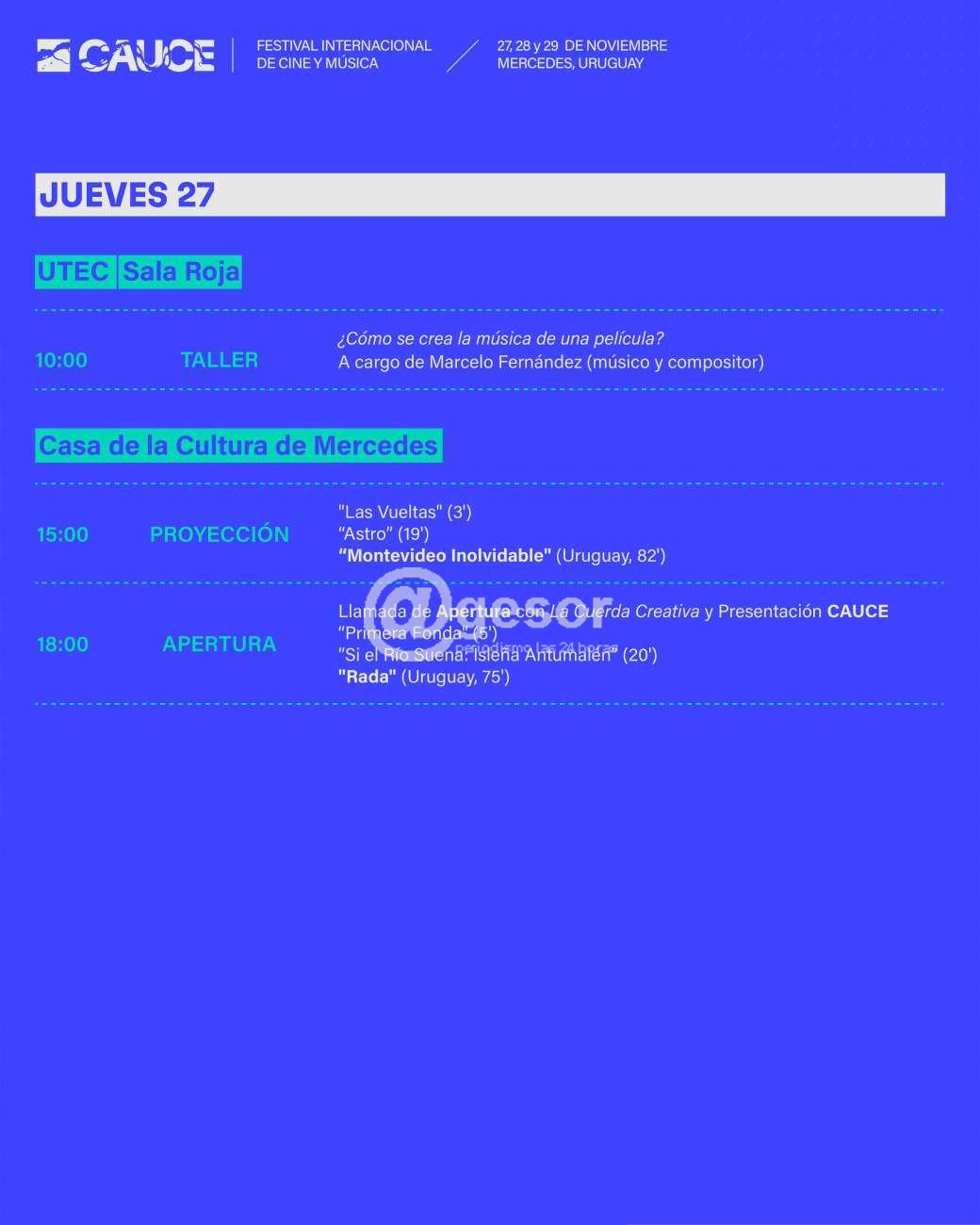 Este jueves 27, viernes 28 y sábado 29, el ciclo CAUCE presenta una vibrante agenda cultural con talleres de cine y fotografía, proyecciones de películas y video arte, además de recitales en vivo