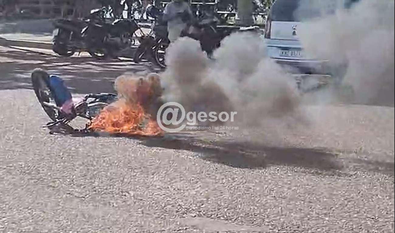 De acuerdo a las versiones primarias recogidas en el lugar, la moto venía perdiendo combustible por la manguera y la alta temperatura más alguna chispa encendió el foco ígneo que llevó a que prácticamente tomara fuego gran parte del vehículo, siendo sofocado el incendio por parte de la dotación de Bomberos que se hizo presente, no habiendo personas heridas ni lesionadas.