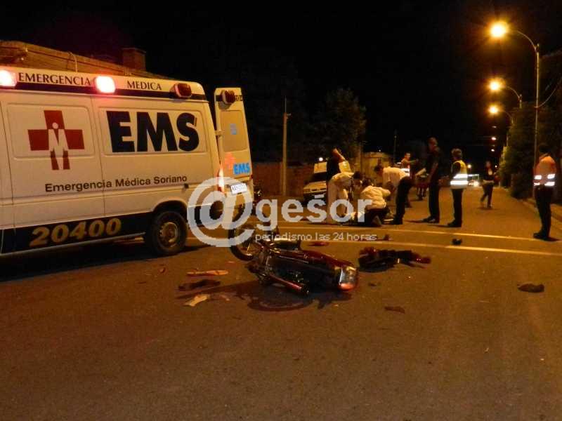 Poco antes de la 4.00 de la madrugada de este domingo ocurrió accidente de tránsito en la intersección de avda. Fregeiro y Herrero y Espinosa, donde entraron en colisión un automóvil de color gris que circulaba por la primera de Oeste a Este y una moto Yumbo Max 110 cc matrícula KMY 142 propiedad de María Florencia Viera Rosso, que era conducida por Joaquín Abel Pedernera Viera de 21 años y llevaba como acompañante a otro joven, quienes lo hacían por Espinosa de Norte a Sur.