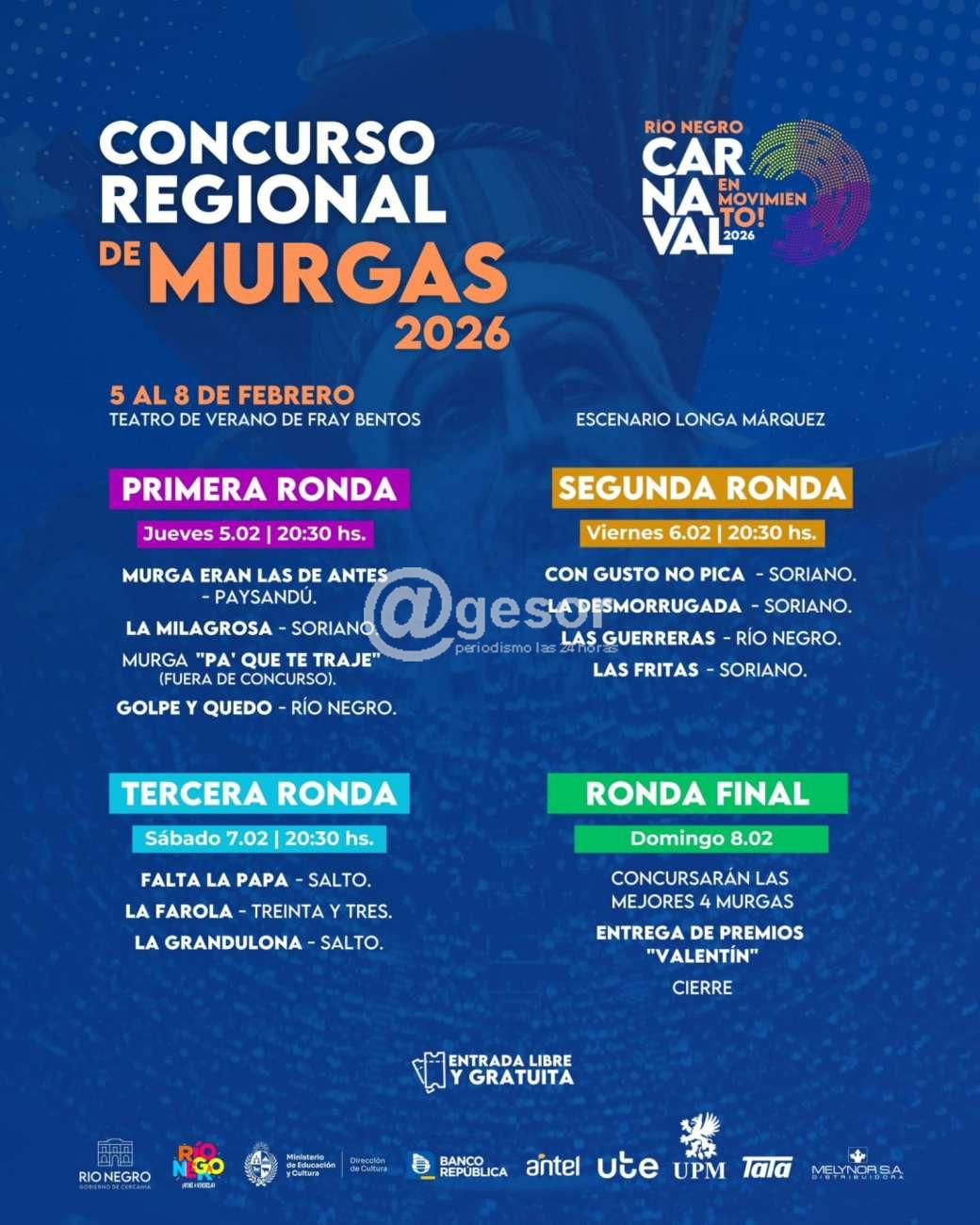 El Concurso Regional de Murgas 2026 ha comenzado a vibrar en el Teatro de Verano de Fray Bentos. Con una cartelera que reúne a exponentes de Río Negro, Paysandú, Salto y Treinta y Tres, es la participación del departamento de Soriano la que despierta una expectativa especial, al presentarse con una sólida delegación de cuatro murgas dispuestas a dar pelea por el primer premio.