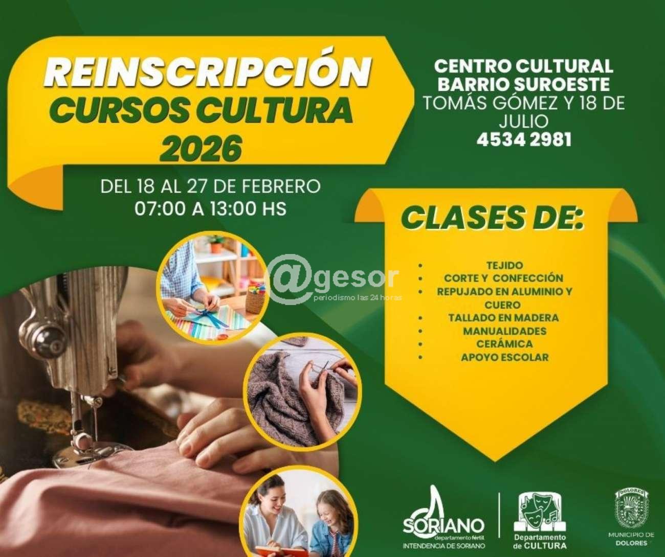Del 18 al 27 de febrero, en el horario de 7:00 a 13:00 horas, se estarán realizando las reinscripciones para los distintos cursos que se dictan en la Casa de la Cultura y el Centro Cultural Barrio Suroeste.