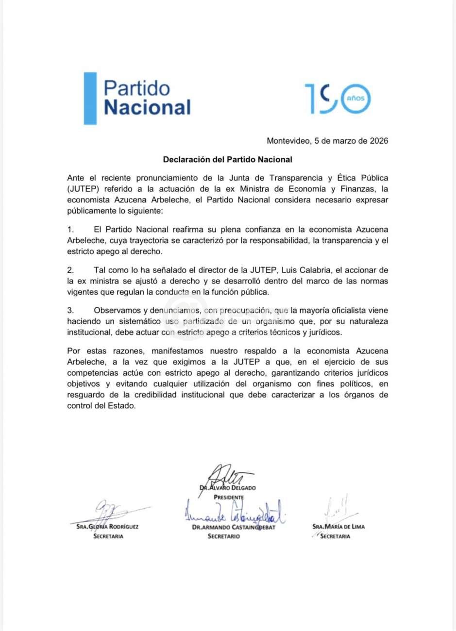 Ante el reciente pronunciamiento de la Junta de Transparencia y Ética Pública (JUTEP) referido a la actuación de la ex Ministra de Economía y Finanzas, la economista Azucena Arbeleche, el Partido Nacional considera necesario expresar públicamente lo siguiente: