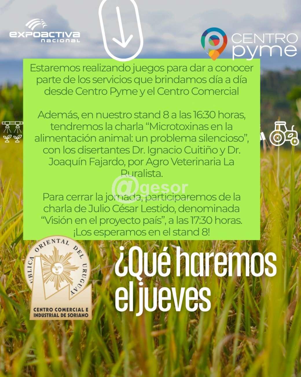 Durante la Expoactiva Nacional, el Centro Comercial e Industrial de Soriano y Centro Pyme estarán presentes con una agenda variada de propuestas. A lo largo de las jornadas se realizarán juegos y dinámicas para dar a conocer los servicios que ambas instituciones brindan diariamente, generando un espacio de intercambio con el público.