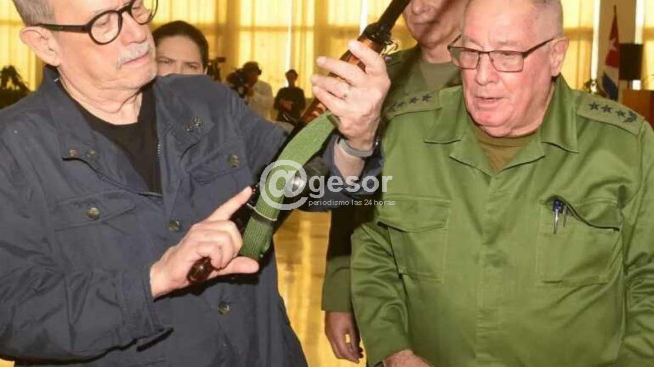 Y lo hace con una arenga, al estilo del héroe clásico: “Exijo mi AKM, si se lanzan. Y conste que lo digo muy en serio”, en su blog personal el pasado miércoles 18 (claro que después borró el mensaje). No fuera a ser cosa que se lo tomaran en serio. Y se lo tomaron en serio, aunque fuera para la televisión y hacerlo feliz como a un niño con un juguete nuevo. El gobierno, en el “Día Nacional de la Defensa”, acto encabezado por el presidente Miguel Díaz-Canel, le hizo entrega de su fusil al ahora héroe-cantautor. Y para que nada le faltase a la comedia, lo hizo con retóricas palabras publicadas en la cuenta “X” de la Presidencia de Cuba: