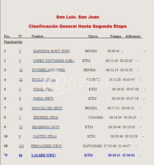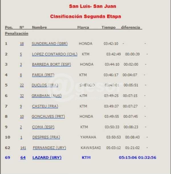Muy buena actuación ha tenido el piloto uruguayo Laurent Lazard (KTM) en la segunda etapa del Rally Dakar 2014 Argentina-Bolivia-Chile, donde tuvieron que afrontar un especial de 359 kilómetros con un primer tramo rápido y las dunas grises de Nihuil en la parte final del recorrido, habiendo unido las ciudades de San Luis con San Rafael..