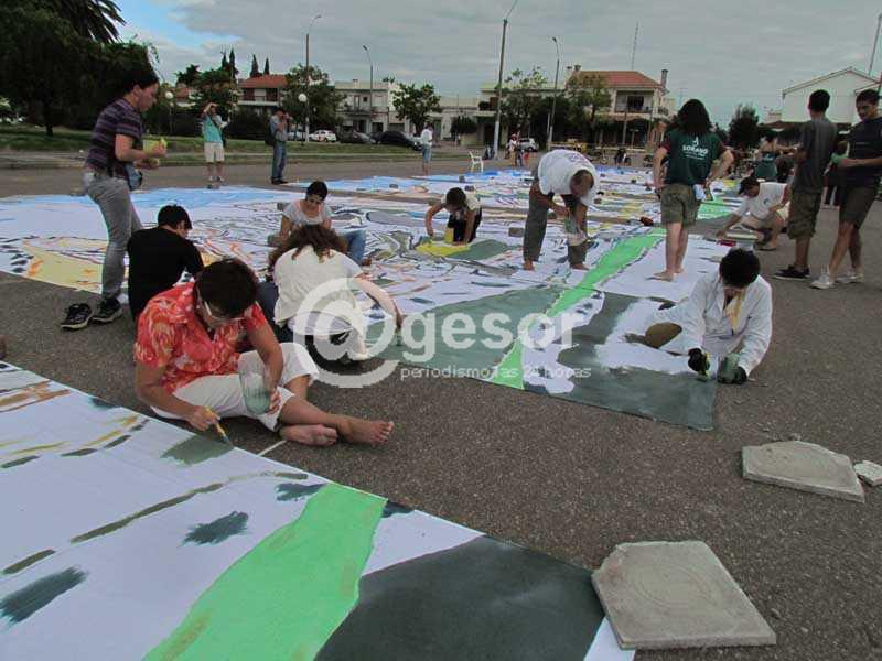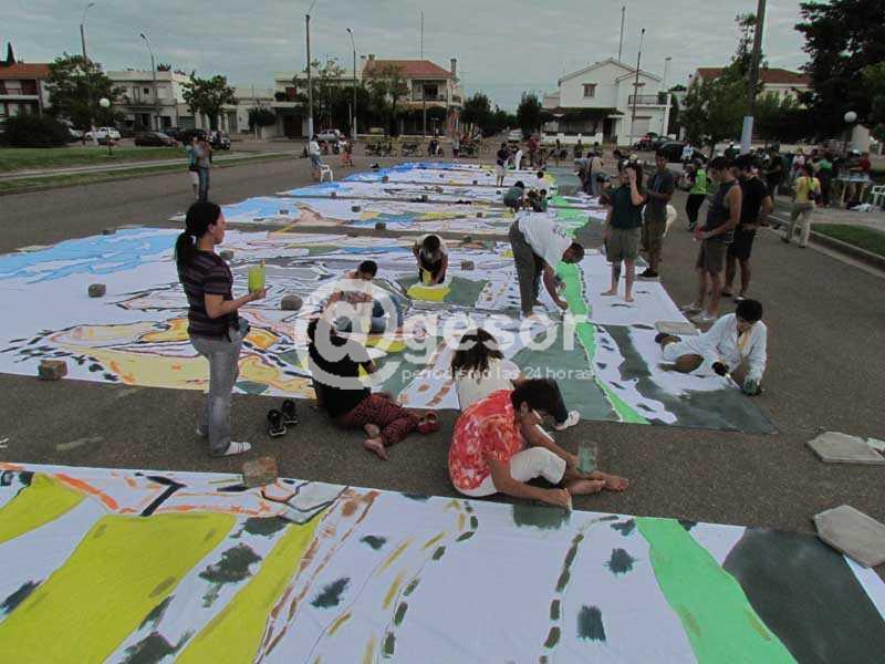 Este mural, pintado en tela ya fue dibujado por lo que este sábado, a partir de las 18 horas se realizará una actividad donde todo aquel que quiera participar podrá participar de la tarea de pintarlo. Por ese motivo se conformaron equipos de trabajo, delimitándose tareas.