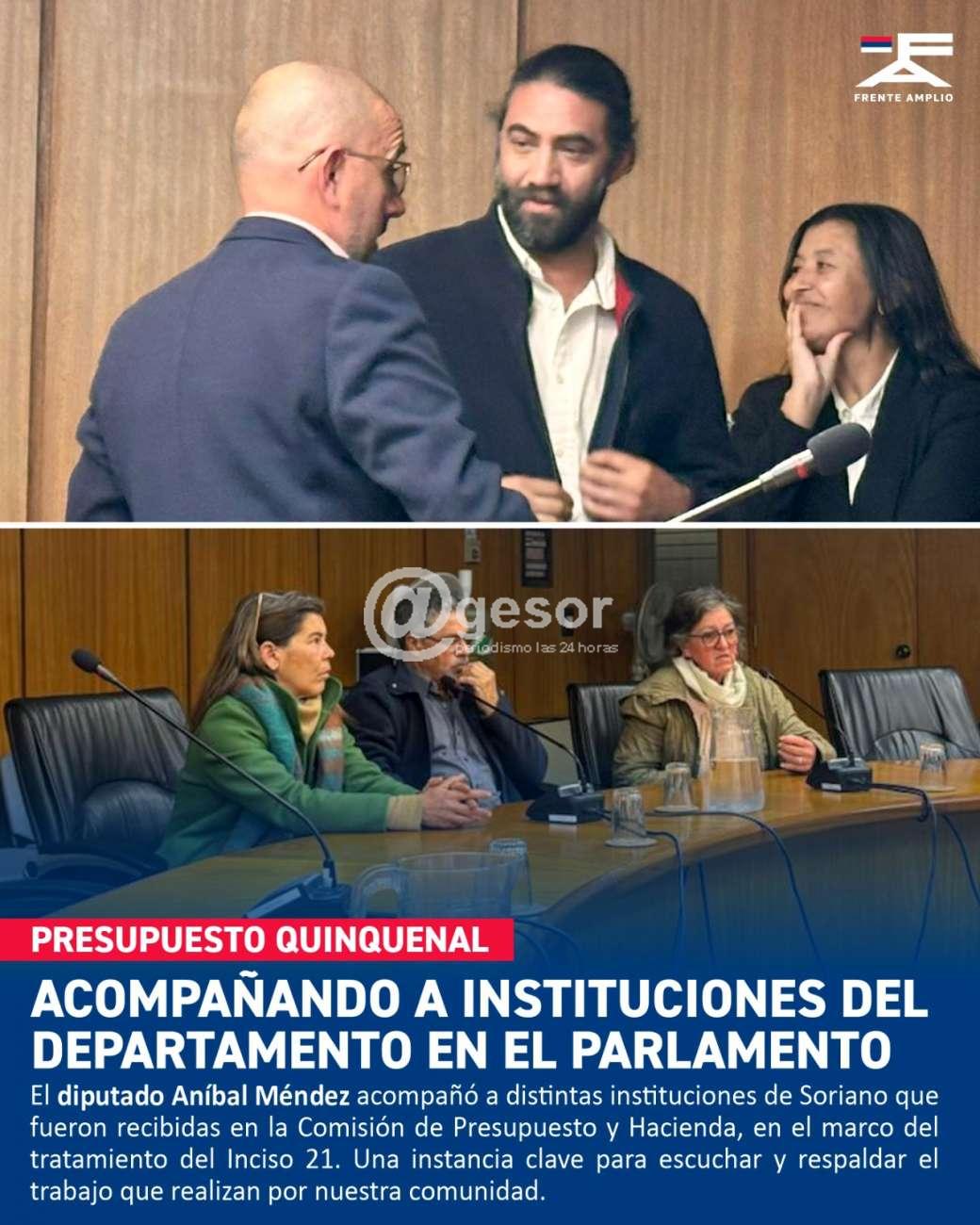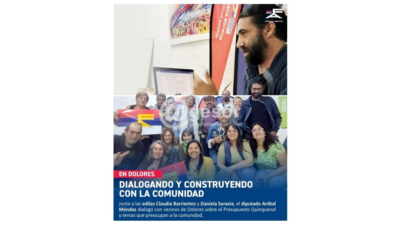 El diputado Aníbal Méndez estará participando en Dolores de una charla abierta sobre el presupuesto quinquenal y las problemáticas locales. Será en el Comité de Base Raúl Castro (Asencio 1790), este jueves 2 de octubre a partir de as 19,30 horas....