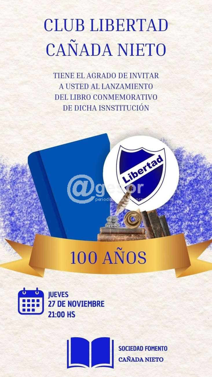 El Club Libertad de Cañada Nieto, en el marco de la celebración de sus 100 años, tiene el agrado de invitar al público en general, a amigos y simpatizantes de la institución, al lanzamiento del Libro Conmemorativo del Centenario.