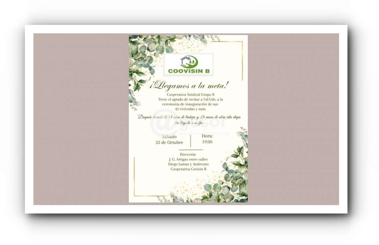 Cooperativa Sindical Grupo B invita a la ceremonia de inauguración de 42 viviendas y salón de usos múltiples. La obra se desarrolló durante 28 meses, luego de más de 14 años de trabajo. Fecha: sábado 25 de octubre Hora: 19:30 ...