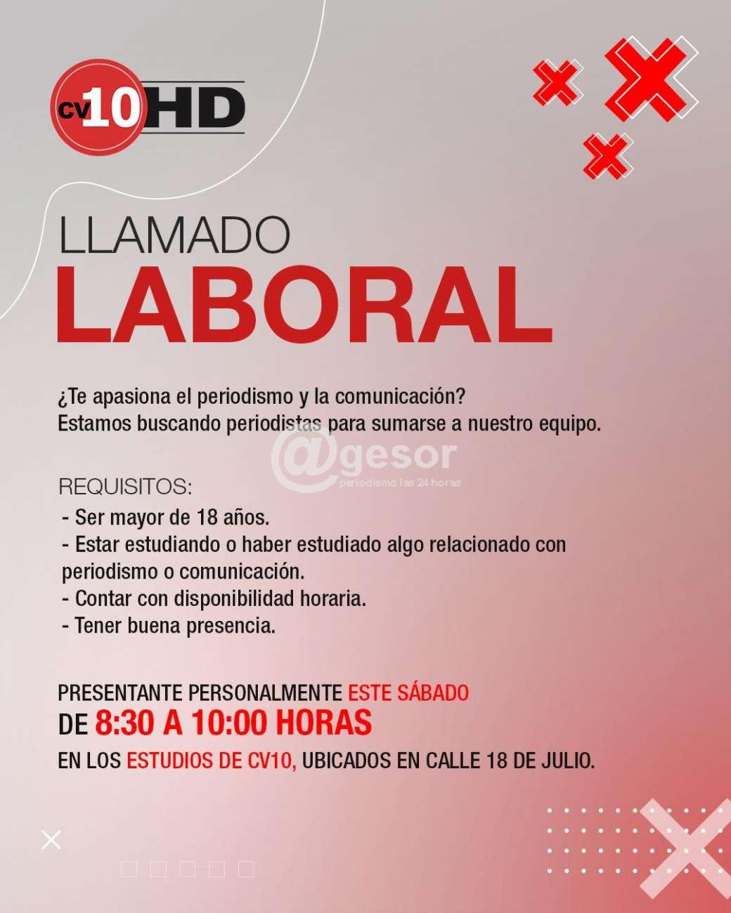 CV10 el Canal Cable de Mercedes está realizando llamado laboral buscando periodistas para sumarse a su equipo. Los requisitos: Ser mayor de 18 años Estar estudiando o haber estudiado algo relacionado con periodismo o comunicación Contar con disponibilidad horaria Tener buena presencia ...